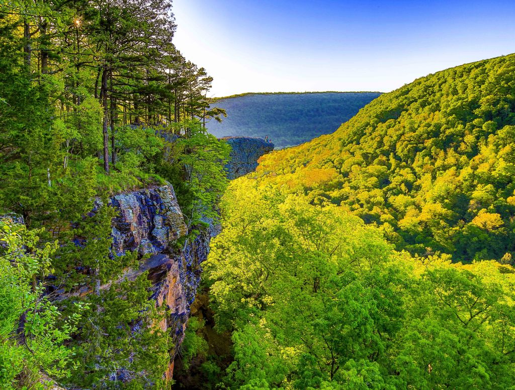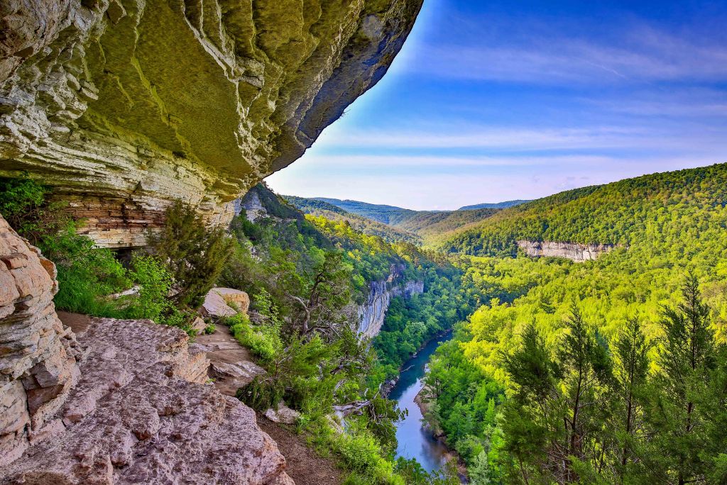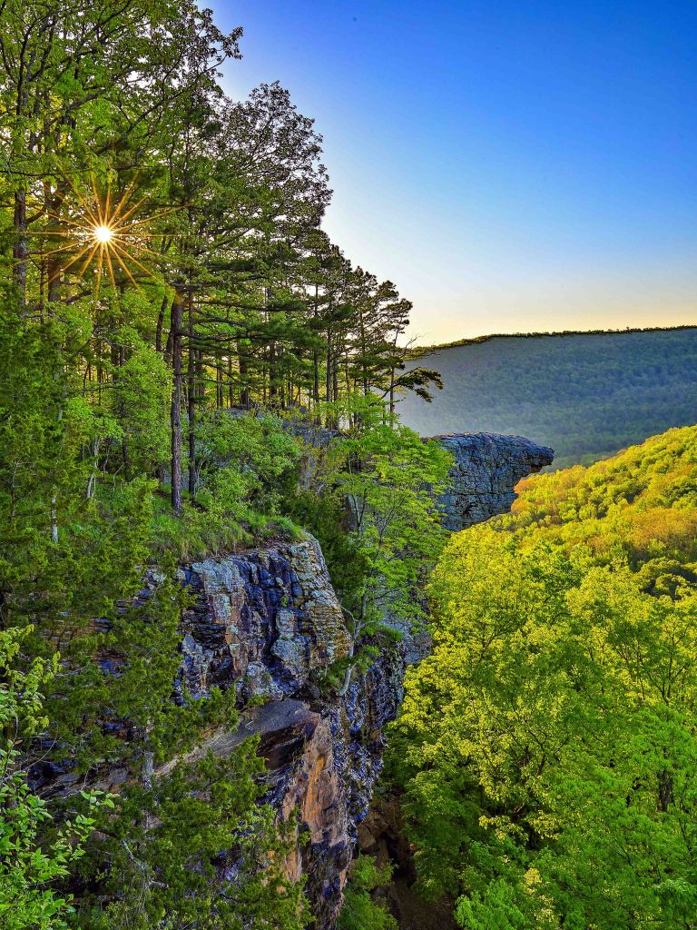 You will quickly see how this moderately rated 6 mile round trip hike is one of the most popular trails in the Ozarks. The destination is the Big Bluff overlooking the famed Buffalo River. At 500′ tall, it is considered the tallest along the Buffalo. The Goat Trail is the narrow ledge that spurs off and is named for the feral descendants of domesticated goats (brought here by pioneers) who either escaped captivity or were turned loose and eventually became wild. AllTrails details here.