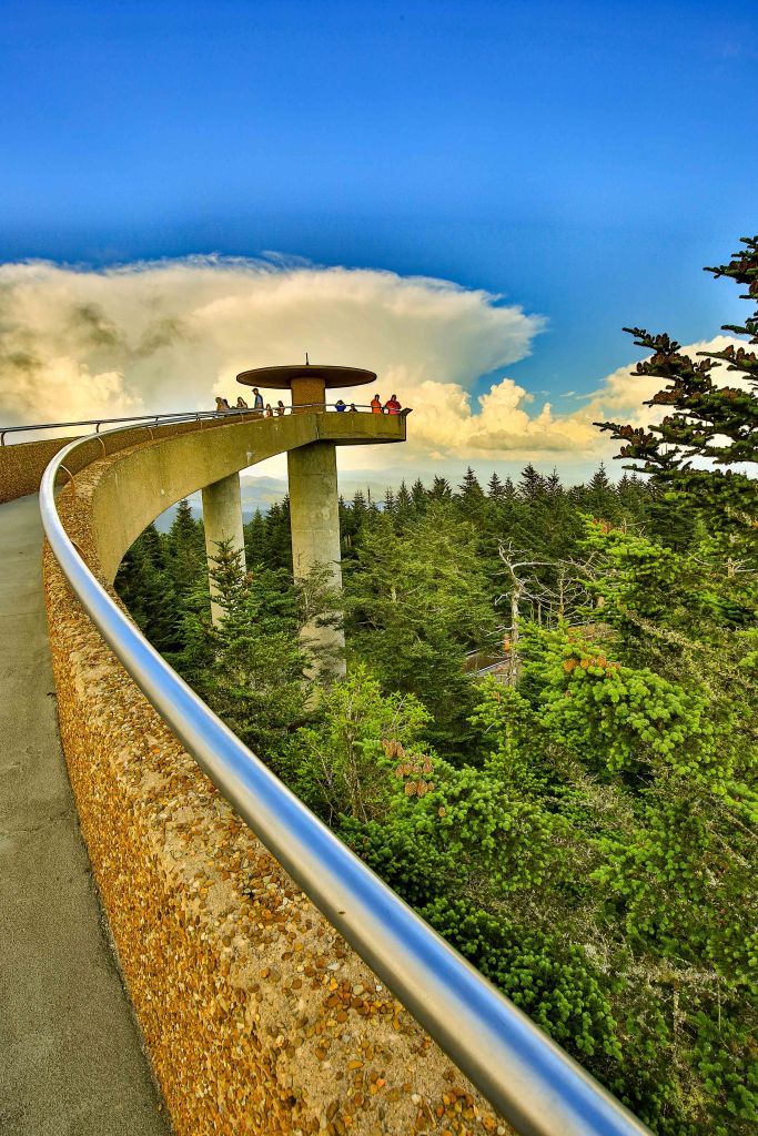 Clingmans Dome is a popular Park destination. Located along the state-line ridge, it is half in North Carolina and half in Tennessee. The peak is accessible after driving Clingmans Dome Road from Newfound Gap, and then walking a steep half-mile trail. The paved trail leads to a 54-foot observation tower. The Appalachian Trail crosses Clingmans Dome, marking the highest point along its 2,144 mile journey.