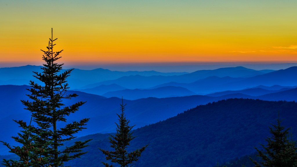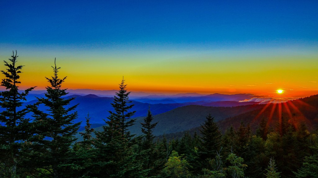 These were the words we kept uttering as we watched the horizon turn shades of gold and hues of blue. We arrived early at Clingmans Dome to get our spot in the parking lot. I decided to use the evergreen tree on the right to hide the camera lens from the bright sun.
