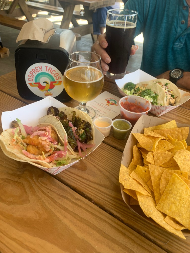 Osprey Tacos and Old Coast Ales. These two establishments are right next door to each other connected by a single wall. Both have outside seating so we choose to sit on the Osprey Tacos side at a well shaded picnic table and enjoy our food and drink. We opted to go with four of the most popular tacos: The Saint Augustine w/ fresh fried local shrimp, the San Diego w/ skirt steak, the Baja Fish w/ local seasonal fish and The Sprout w/ fresh Brussel sprouts. Our favorites were the San Diego and the Sprout… would definitely get those again. The other two were tasty, for sure. The beer from Old Coast Ales was refreshing and we made good choices. For me it was the Lite-House a Blonde Ale, a light, crisp and refreshing ale. For Mike it was the Kookaburra, a coffee brown ale infused with locally-roasted Kookaburra coffee.
