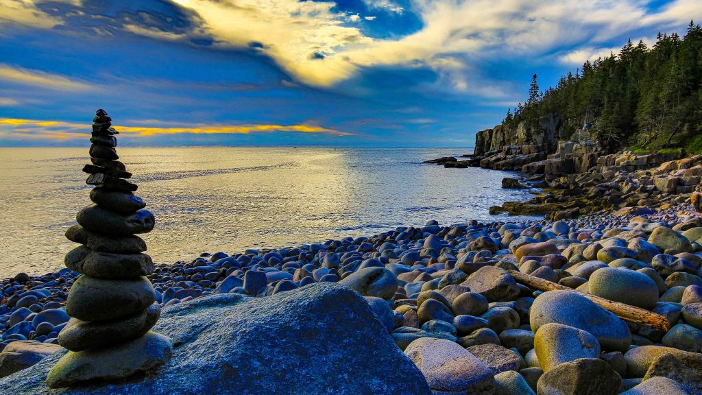 Monument Cove, one of the most iconic spots along the Ocean Path in Acadia National Park. Its name comes from a natural pillar of granite that stands upright on the beach. It looks just like a monument and stands just a few feet from the coast. The pillar is said to have formed at least 500 years ago and experts say it should stand for several more centuries. Photographers and sightseers stop at the cove to marvel at the granite pillar and the sweeping views of the ocean and rocky cliffs