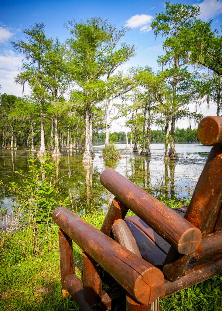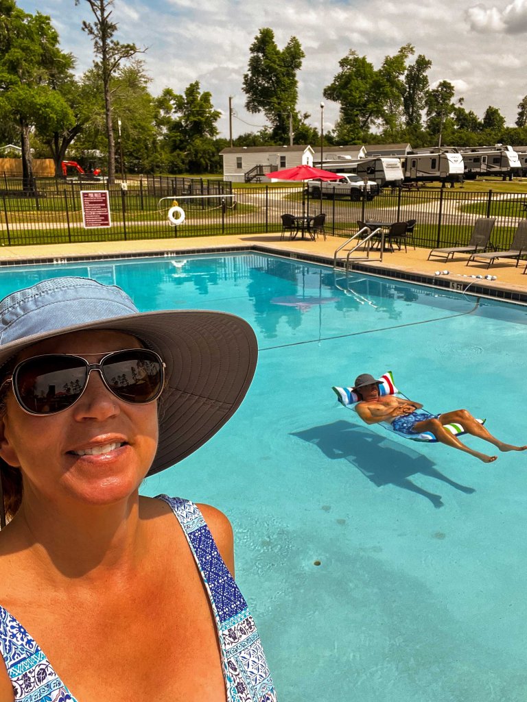 Besides the magnificent displays of nature with the sunrises featuring fog on the water and cypress by moonlight, during the day we would enjoy shade by the water on the benches, pool time, and walk the park to say hello to fellow campers.