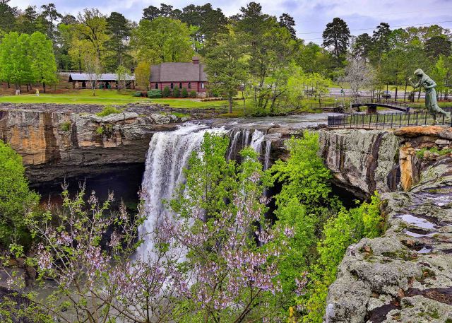 At the entrance to the Campground is this natural wonder, Noccalula Falls. A 90-foot waterfall named for Noccalula, a young Cherokee maiden who plunged to her untimely death rather than forsake her true love. She is memorialized by a statue and the engraved story of her fate.