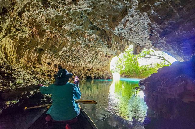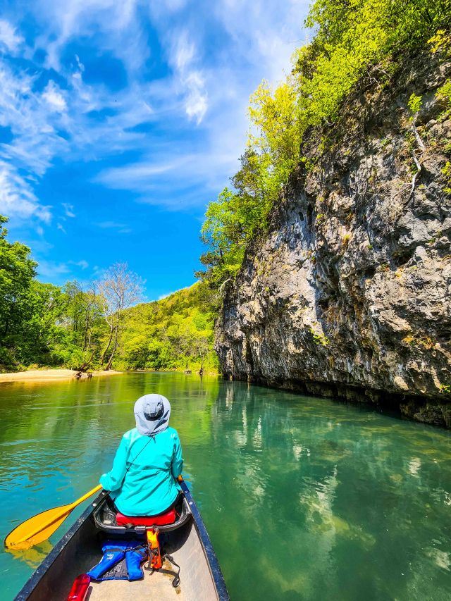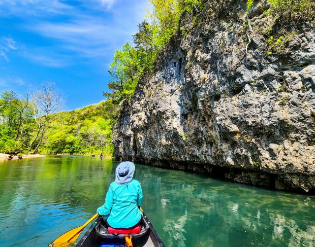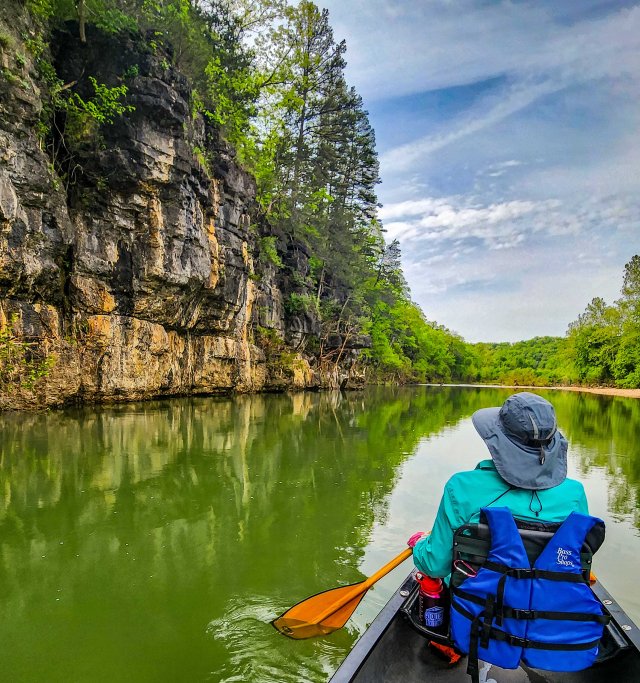 With the help of Carr’s Canoe Rental in Eminence, our first paddle was a short 9.5-miles from Pulltite to Round Springs where we saw an eagle soar above us, explored the famous Pulltite Spring (a short walk), amazing rock bluffs, Sinking Creek and solitude, sweet solitude with nary any other paddlers the majority of the trip.