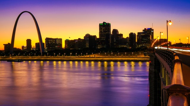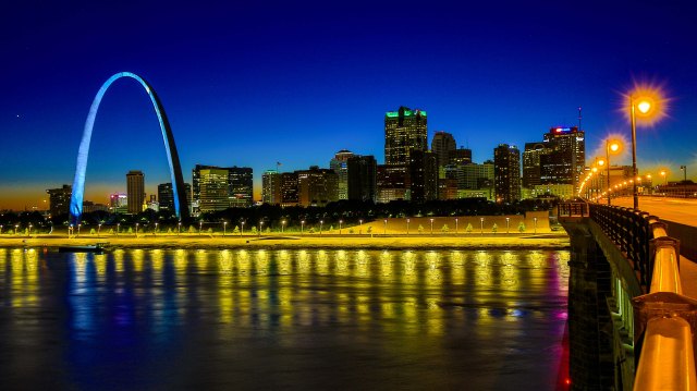 The Gateway Arch, now illuminated, stands like a beacon, a symbol of the city’s enduring spirit.