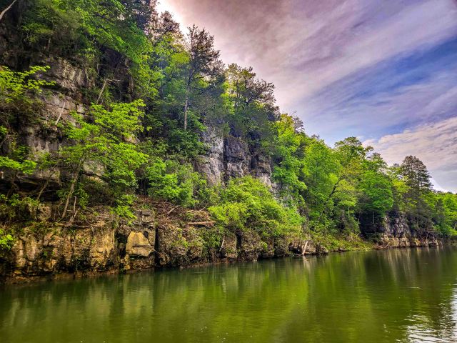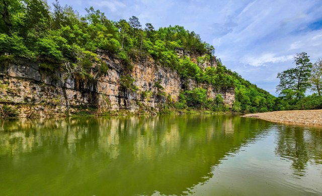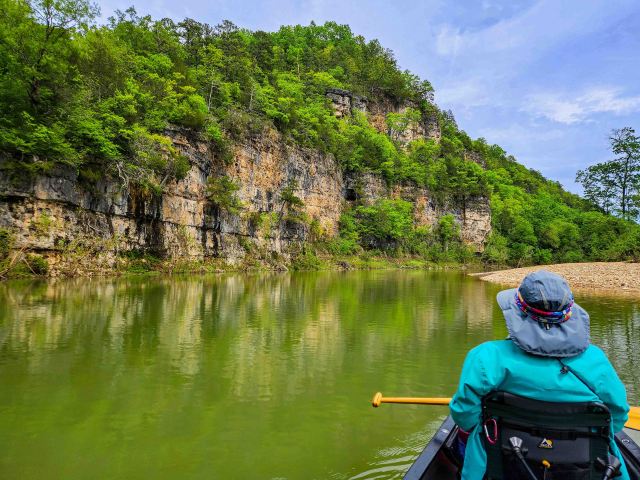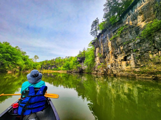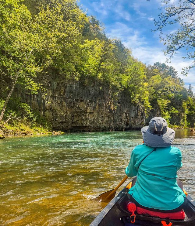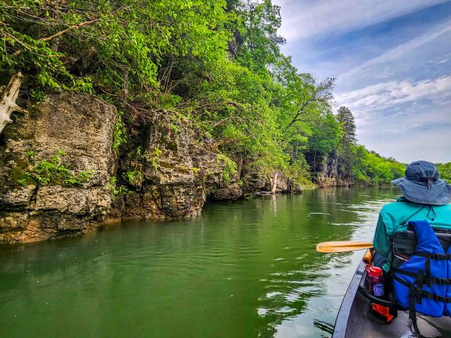 We were there in April, perfect for the higher water levels to paddle the 24-mile section from Bucks Hollow to Mill Springs Campground. This was a full day of paddling/floating but was an AMAZING day with eagle, osprey and hawk sightings as well as a brief sighting of an otter family, and…. Swimming Deer!