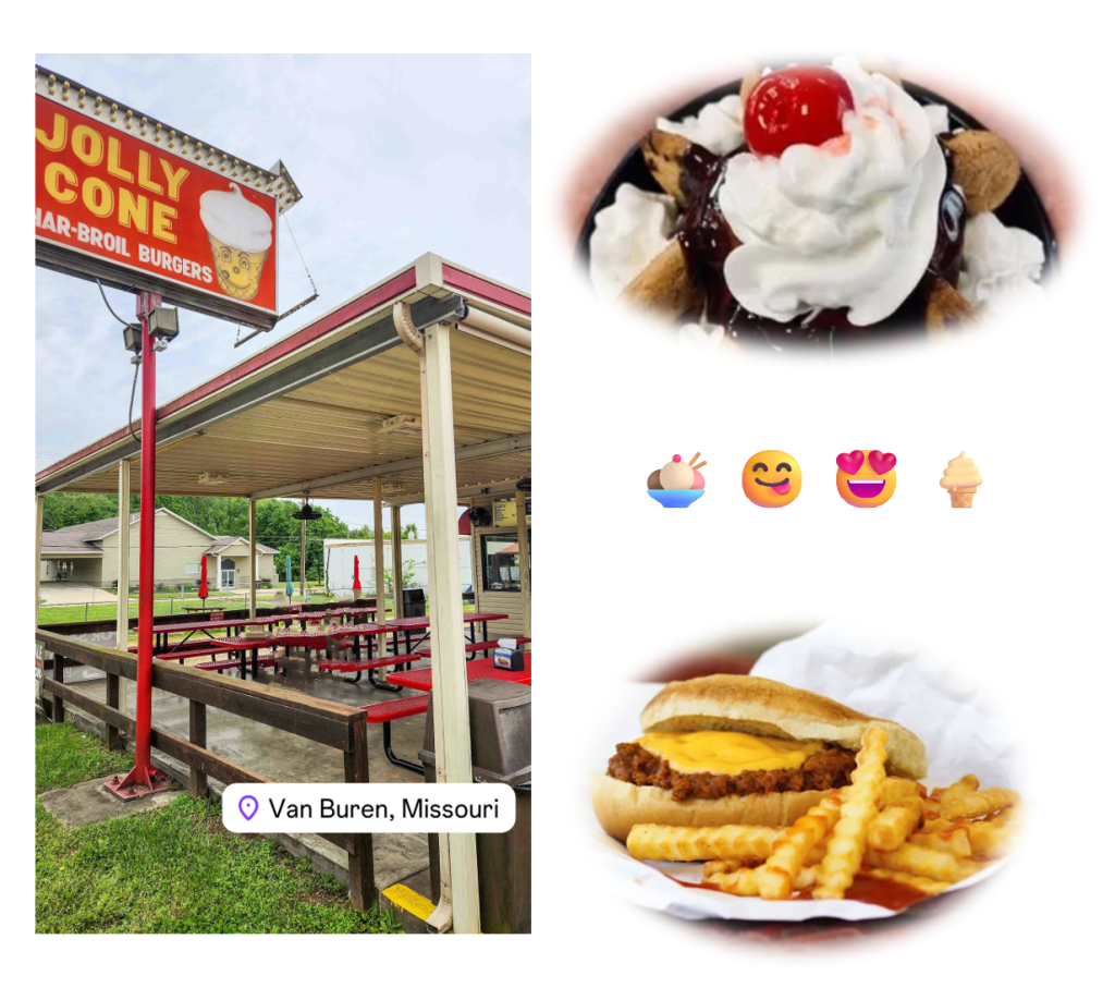 Approximately a 1-hour from our campsite in Eminence, Big Springs is well worth the scenic drive, especially if you stop by The Jolly Cone, a local favorite in Van Buren for fast food eats and a delicious cool treat.