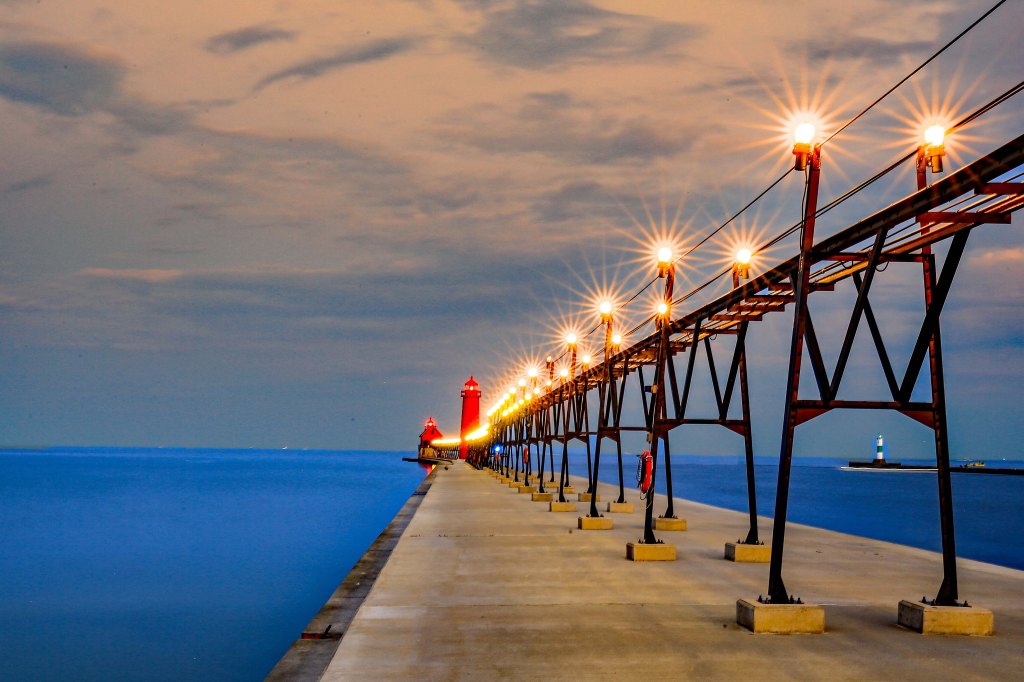 Established in 1839, two lights on the south pier, both painted red, are connected by a lighted catwalk that also connects them to the shore and the Grand Haven Boardwalk. The inner light is cylindrical, and the foghouse outer light stands on a huge concrete foundation. People often enjoy a stroll along the boardwalk that borders the Grand River channel and the pier, making the Grand Haven lighthouses one of the most photographed lighthouses in the Midwest.