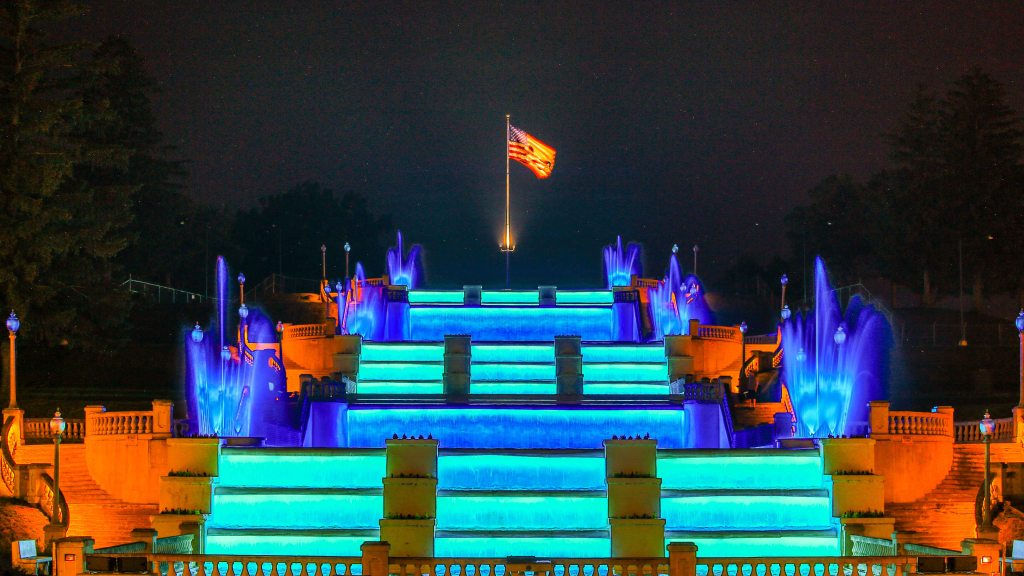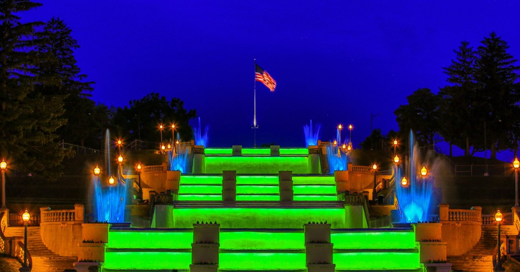 The Cascade Falls were built in 1932 in Jackson, Michigan. They are the result of William Sparks’ dream to do something for the people of Jackson and to build an attraction that would provide visitors with a positive impression of the city. The Cascades Falls are 500 feet in length, a vertical height of 64 feet, and a total width of 60 feet. There are 6 fountains, 16 Falls (11 are illuminated), 1,230 Colored Electric Lights, and a 2,000 gallon per minute water pump that filters, chlorinates, and recycles water in a closed loop system. There are 126 steps along each side of the Falls.